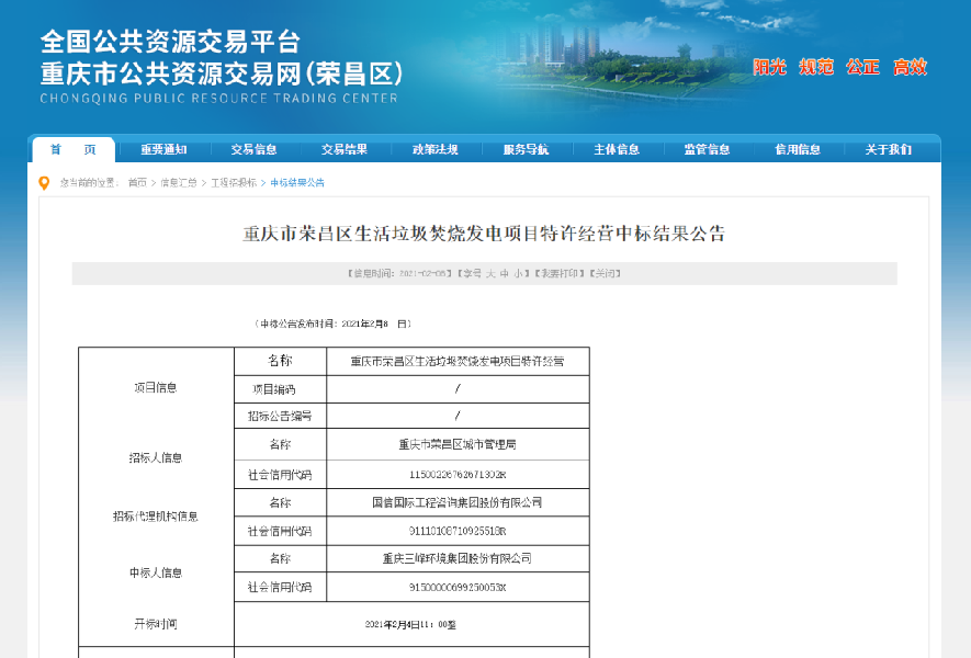 日前,榮昌區城市管理局確認,三峰環(huán)境中標榮昌區生活垃圾焚燒發(fā)電特許經(jīng)營(yíng)項目。本項目設計處理能力為900噸/天,其中一期規模600噸/天,配置1臺600噸/天的機械爐排爐和1臺15MW抽凝式汽輪發(fā)電機組,特許經(jīng)營(yíng)期30年(含2年建設期)。 (供稿:黃瑞杰)