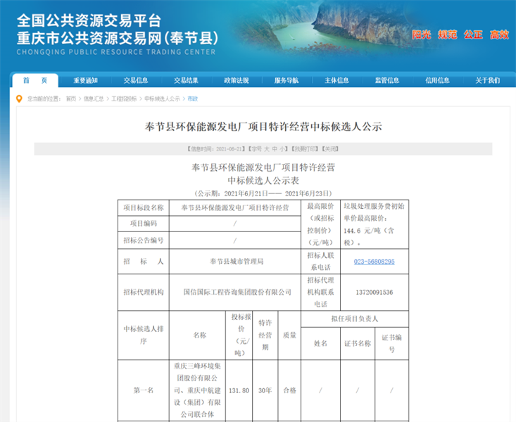 6月21日,市公共資源交易網(wǎng)發(fā)布了奉節縣環(huán)保能源發(fā)電廠(chǎng)項目特許經(jīng)營(yíng)中標候選人公示,三峰環(huán)境聯(lián)合體為該項目第一中標候選人,中標金額為131.8元/噸。