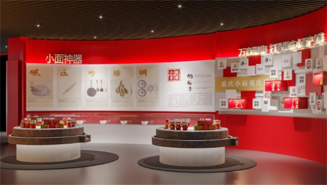 博覽館總面積約350平方米,由序廳、一面之緣、天天見(jiàn)面、別開(kāi)生面四個(gè)展廳構成?!靶驈d”由雕塑場(chǎng)景從義渡口走出的第一碗小面和門(mén)頭“重慶小面博覽館”“麻辣鮮香 流轉千年”組成?!耙幻嬷墶眲t展示了重慶小面發(fā)展簡(jiǎn)史?!疤焯煲?jiàn)面”,探尋小面美食之謎,在耐人尋味展區,展示了各類(lèi)知名小面品牌、佐料品牌、煮面工具以及小面相關(guān)的非遺傳承大師及技法等?!皠e開(kāi)生面”展示了萬(wàn)商集聚,打造重慶小面產(chǎn)業(yè)鏈等。